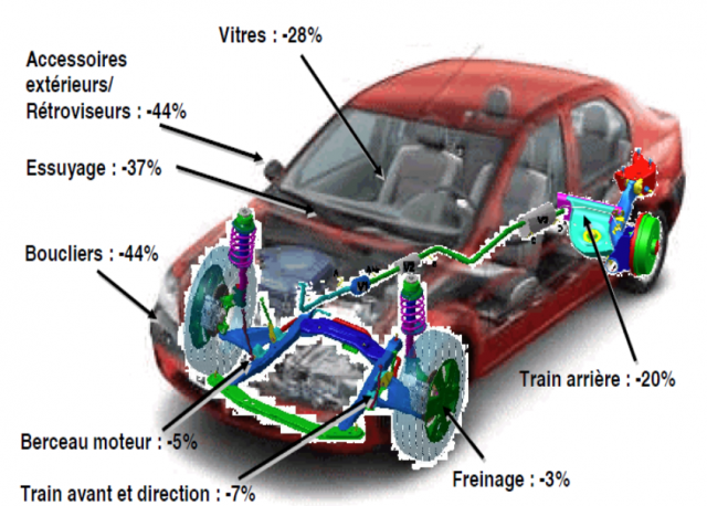 En termes d’offre, le modèle est allé très loin en décryptant, en amont, les vecteurs possibles de baisse des prix. Le succès de la Logan de Renault repose ainsi sur une redéfinition drastique des coûts de conception (« design to cost ») couplée à la recherche de la réutilisation de pièces existantes (« carry over »). On arrive alors à de réelles économies permettant de répondre à la demande avec un modèle simple mais fiable, au prix contenu. Le schéma suivant montre les économies réalisées sur le modèle Logan de Dacia par rapport à la Clio 2 de Renault.