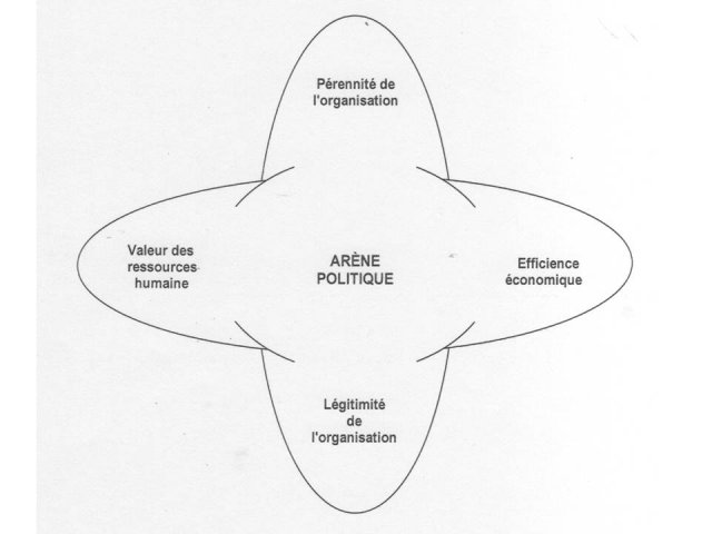 Ce modèle est donc quadridimensionnel et les auteurs démontrent qu’il existe une interrelation importante entre les différents axes. En poursuivant leurs travaux, les auteurs montrent que l’efficacité organisationnelle est le produit des quatre dimensions que l’on peut faire converger dans une « arène politique » comme le montre le schéma suivant :