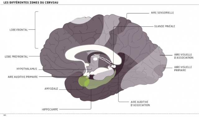 Les régions du cerveau identifiées comme déclencheur de l’émotion sont l’amygdale située au fond du lobe temporal, une partie du lobe frontal (le cortex préfrontal ventromédian) ainsi qu’une autre région frontale et le cortex cingulaire. Ces zones réagissent à des stimuli naturels, aux structures électrochimiques qui sous-tendent les images dans notre cerveau mais aussi à un courant électrique appliqué au cerveau. L’amygdale joue un rôle particulièrement important en matière de déclenchement de la peur et de la colère. Le lobe frontal quant à lui est une zone particulièrement importante pour détecter des stimuli susceptibles de déclencher des émotions sociales.