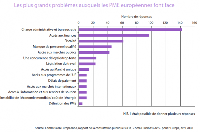 Au sein de l’Union Européenne, est considérée comme étant une PME, une entreprise ayant moins de 250 travailleurs, qui est indépendante d’entreprises de plus grande taille, et dont le chiffre d’affaires annuel et le total du bilan ne dépassent pas respectivement 50 et 43 millions d’euros. Compte tenu de ces critères, l’Union Européenne, en 2008, comprend 23 millions de PME qui constituent ainsi 99,8% des entreprises européennes et représentent 67,1 % de l’emploi du secteur privé. Ce poids économique prépondérant a amené la Commission européenne à lancer une vaste consultation publique visant à mieux cerner les besoins des PME en vue de favoriser leur développement et ainsi la création d’emplois. Il s’est avéré, au regard des réponses apportées, que le premier problème auquel les PME européennes étaient confrontées portait sur le poids de la charge administrative et de la bureaucratie. De même, les enquêtes menées ont montré que plus de 10 % des entreprises unipersonnelles (avec un seul propriétaire) procéderaient à des embauches si le poids des formalités était moindre, ce qui représenterait la création d’1,5 millions d’emplois.