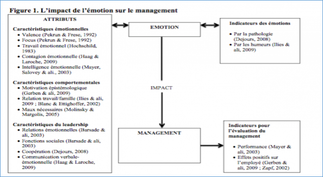 Une étude de 2014 a cherché à mesurer l’impact de l’émotion sur la performance managériale (Morgue et Leszczynska, IPAG et GREDEG, université de Nice, 2014). Les deux chercheurs ont essayé d’établir un lien entre l’impact des émotions sur le comportement physique et psychique, et un mode de management émotionnellement performant. Les auteures de la recherche ont ensuite essayé de modéliser leurs travaux, grâce aux schéma suivant :