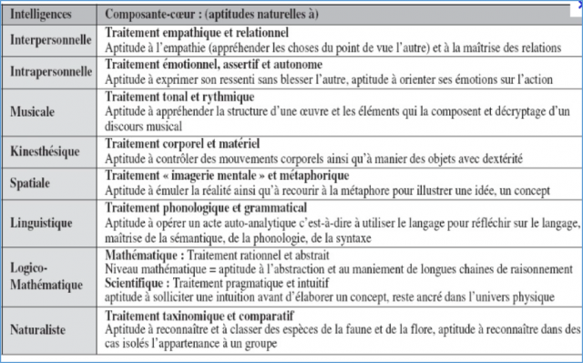 Source : D’après les travaux de Gardner in « L’accompagnement du changement professionnel, l’apport de la théorie des intelligences multiples de Gardner » par Yves Richez