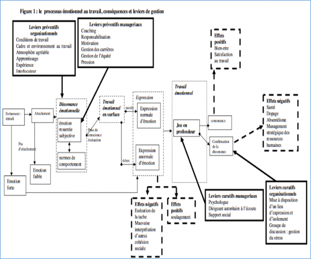 On peut voir que c’est de la dissonance émotionnelle (divergence entre les attendus et les ressentis) que naissent les émotions, parfois négatives, avec les conséquences à un double niveau. Lors de l’expression des émotions, on peut se heurter à des perceptions erronées ainsi qu’à des effets pervers quant au travail (inhibition, perte de confiance, blocage…). Dans un second temps, lors du travail émotionnel (plus en profondeur), la dissonance persistante peut donner lieu à des effets négatifs lourds (absentéisme, stress, problèmes de santé…).
