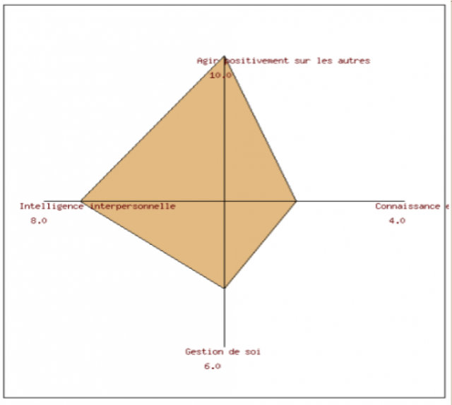 Un profil « équilibré » présentera une figure proche d’un carré, le test visant à confronter le candidat avec ses résultats et non obtenir une figure parfaite. Par exemple, dans la figure suivante, le candidat montre une aptitude très forte à comprendre les autres et à gérer les relations interpersonnelles, mais devra expliquer le score assez faible en « connaissance de soi » (à droite de l’axe horizontal).