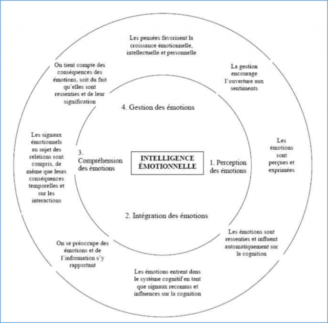 C’est en 1990 que l’intelligence émotionnelle va vraiment être définie (voir en introduction) par Salovey et Mayer. Ils postulent que c’est une forme d’intelligence sociale et rappellent qu’elle est basée sur le contrôle de ses émotions et de celle des autres. Cette approche est, de plus, orientée sur l’action, ce qui l’ancre définitivement dans la pensée managériale, qui recherche des leviers d’action pour les managers confrontés à la crise. Schématiser cette approche peut permettre d’en capter les éléments-clés :