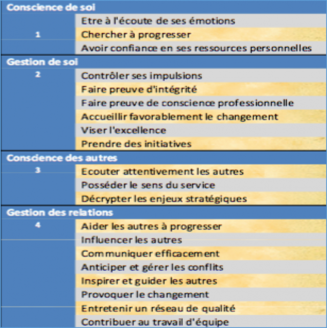 C’est, historiquement, le plus connu mais aussi le plus simple à retenir. Il regroupe 4 grandes compétences, autour de 2 « axes » (conscience de soi/des autres et maîtrise de soi/régulation des autres). La conscience de soi regroupe plusieurs capacités autour de nos ressources personnelles et de leur exploitation, alors que la conscience sociale est plus liée à la détection des émotions d’autrui. Quant à l’autre axe, il est dynamique car il s’agit de maîtriser ses propres émotions ou de gérer celles des autres, ce qui demeure essentiel pour un manager. Voici la déclinaison de ces 4 compétences en 20 sous-compétences :