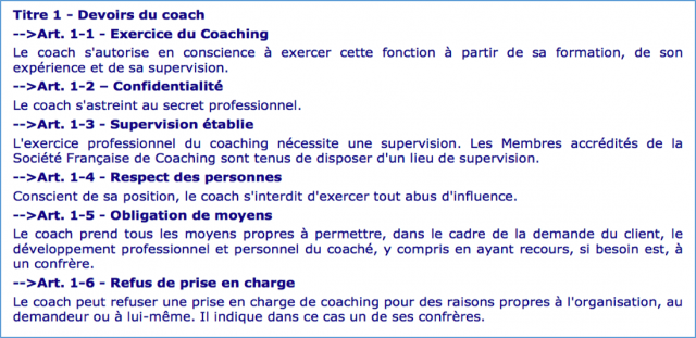 On peut voir, dans cet extrait du code de déontologie de la société française de coaching, que l’accent est mis sur la responsabilité et la posture du coach (pas d’influence).