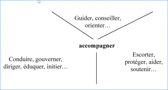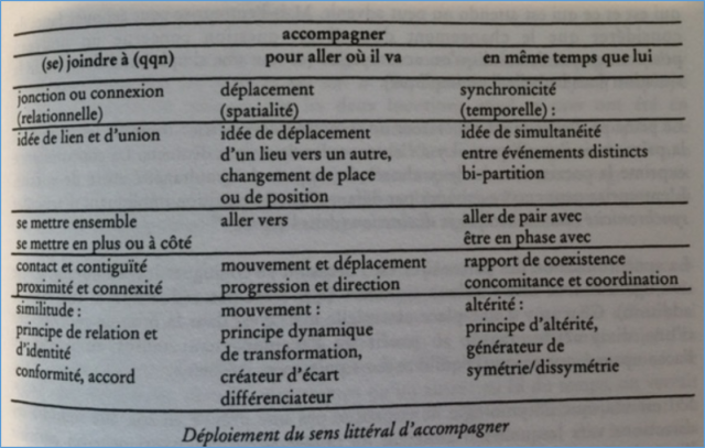 Pour résumer cette approche littérale et en reprenant les principales idées du tableau, on pourrait dire qu’accompagner ce serait donc « se joindre à quelqu’un, pour aller, en même temps que lui, où il va ».