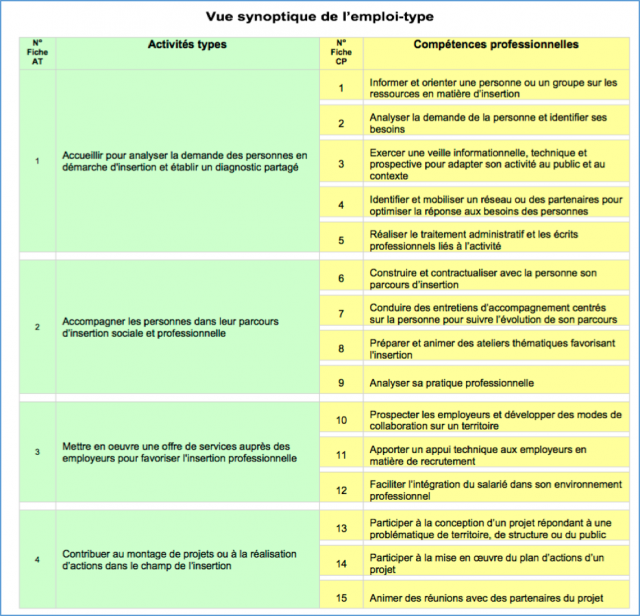 L’accompagnateur développe un certain nombre de compétences qui peuvent donner lieu à la mise en place d’un référentiel. Le cadre du conseil en insertion professionnelle a été posé à travers la création d’un titre professionnel de niveau III, au RNCP ; au référentiel professionnel bâti autour de 4 activités et 15 compétences clés :