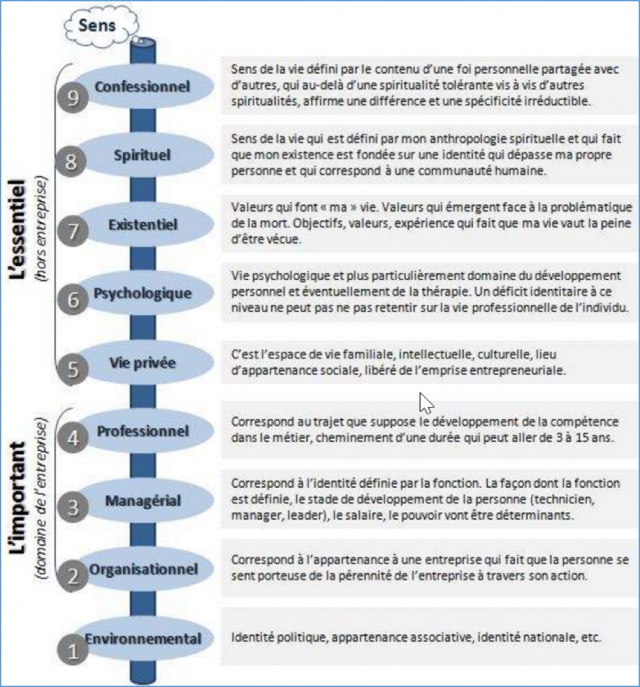 La recherche du « pourquoi » renvoie à des travaux profonds, en particulier de certains philosophes. L’approche d’Habermas (Habermas, 1976) présente un réel éclairage car il relève un triple intérêt à l’accompagnement (technique/pratique/émancipateur). L’intérêt est d’abord technique car l’accompagnement va fournir des méthodes et de la matière, ce peut être le cas pour l’accompagnement scolaire, jadis centré sur la matière et aujourd’hui ancré sur le relationnel et les méthodes. L’intérêt pratique s’oppose à l’intérêt technique, l’accompagnement servant ici à donner du sens à quelque chose. Une grande partie des coaches s’attache à travailler dans cette direction alors que la commande est plutôt « technique ». Au-delà des méthodes, le coaché va découvrir ce qui fait sens pour lui et travailler sur une dimension plus spirituelle comme on peut le voir dans le schéma de Vincent Lenhardt :