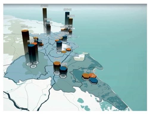 La data visualisation facilite la lecture des données massives. En effet la mise en forme graphique appropriée permet de communiquer beaucoup d’informations en peu d’espace et met en évidence des phénomènes non visibles à la lecture de tableaux tels que les corrélations [13] par exemple. La visualisation en temps réel est une technologie clé.
