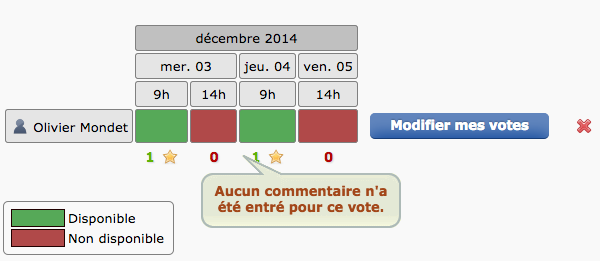 Vous pouvez également voir si les participants ont indiqué des commentaires (en survolant les noms des participants) et suivre la date idéale de réunion au pied du sondage (indiquée par une étoile) :