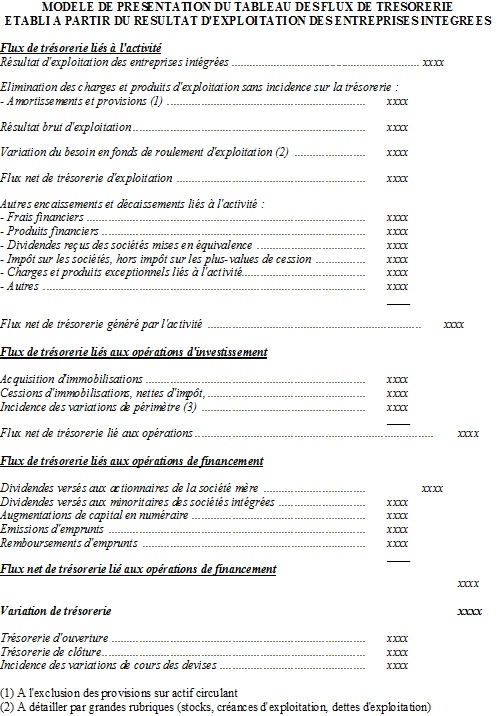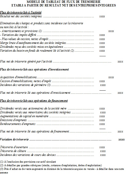 - obligatoire pour les entreprises présentant des comptes consolidés : elles doivent se conformer soit au référentiel français et inclure le tableau des flux de trésorerie dans l’annexe comptable, soit au référentiel IFRS et intégrer ce tableau dans leurs états financiers (IAS 1). En 2009, le Conseil National de la Comptabilité a émis une recommandation (n° 2009-R-03) relative au format des états financiers des entreprises sous référentiel comptable international (hors entreprises de banque et d’assurance) et a apporté des précisions concernant la présentation de ce tableau, considéré comme un état financier à part entière.