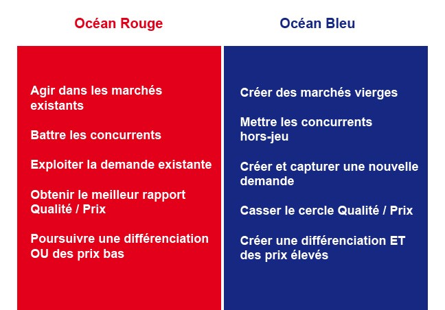 Pour la comprendre, le mieux est de la comparer à la stratégie de l’Océan Rouge. L’Océan Rouge est l’approche traditionnelle : l’environnement du marché est connu, les entreprises s’y font la guerre (jusque au sang rouge…) pour gagner des parts de marché, les unes par rapport aux autres, face à une demande existante. L’aspect concurrentiel y est omniprésent.