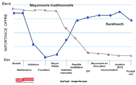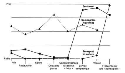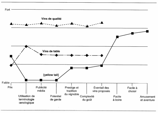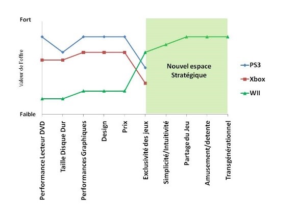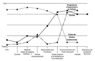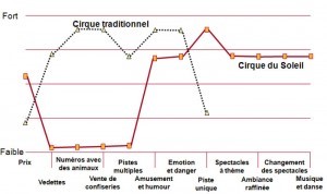 C’est un graphique représenté par deux axes : en abscisses, la liste des critères qui ont de la valeur pour les clients du marché traditionnel dans lequel évolue l’entreprise actuellement ; en ordonnées, les performances de l’offre (traduites en terme de « basses » près de l’axe des abscisses, jusque « élevée » vers le haut du graphique).