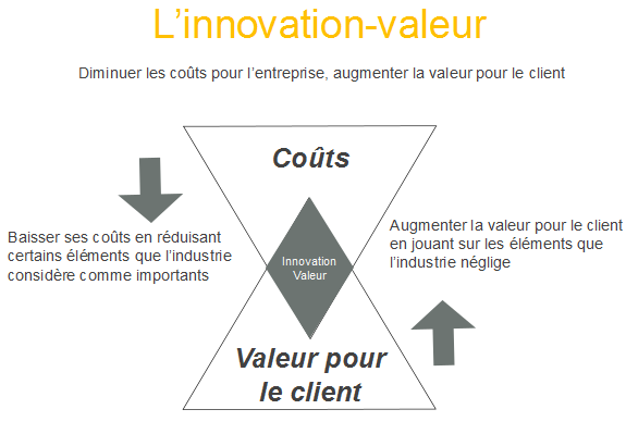 Créer une nouvelle demande peut passer par une innovation de produit ou service mais il est fondamental de préciser que celle-ci n’est pas seulement technologique. Elle se doit d’être une « innovation valeur ». C’est la base essentielle de la stratégie Océan Bleu. Cela signifie que l’innovation qui va créer cette nouvelle demande doit impérativement apporter de la valeur et ce non seulement pour l’entreprise (rentabilité), mais également pour l’acheteur (utilité).