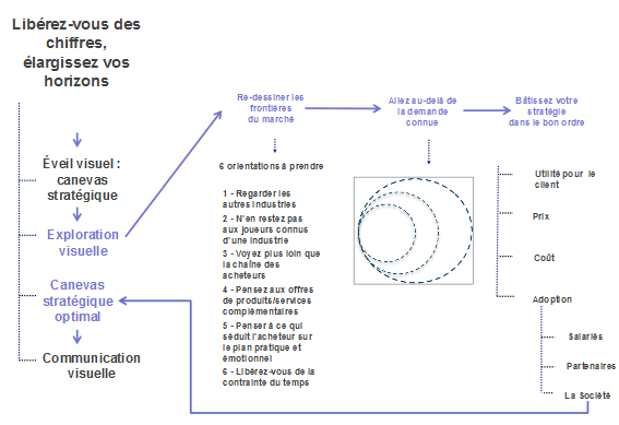 - Une nouvelle planification stratégique. Une fois les pistes de recherches explorées, comment aller au-delà des petites améliorations et arriver à se focaliser sur les problèmes prioritaires à résoudre pour créer cette demande ? Il faut là aussi sortir du plan stratégique type (analyse du marché actuel, proposer une solution de gain de parts de marché par différentiation ou diminution des coûts, puis se fixer des objectifs).