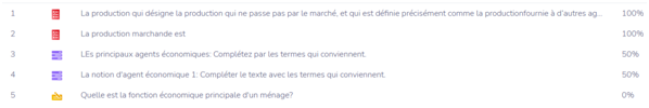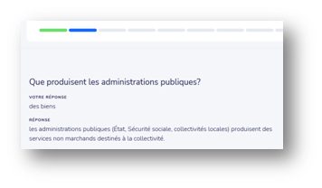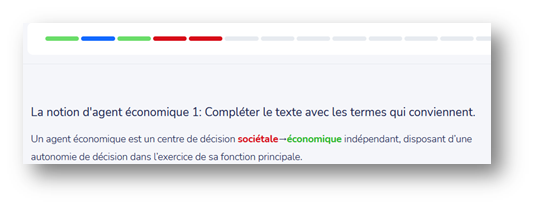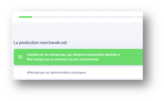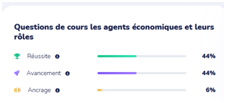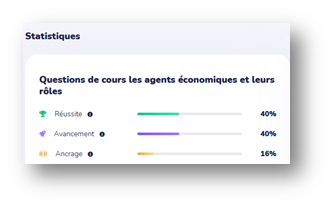Il s’agit de varier les propositions pour l’élève. Tout au long du test, une barre précise le nombre de questions ainsi que le taux de réussite par une couleur définie. Chaque élève a accès à ses progrès. Au cours de l’usage du test, en tant que professeur, vous avez accès aux statistiques globales du groupe d’élèves, et aux statistiques par élève et par question. Il sera ensuite facile de créer une séance de remédiation par exemple.