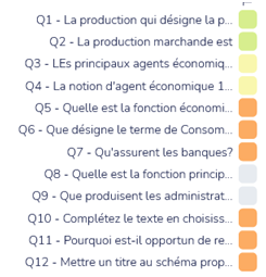 L’algorithme de Wooflash estime que les questions sont plus ou moins réussies en fonction d’un code couleur qui varie du rouge foncé au vert foncé, de beaucoup de lacunes à correct, en passant par l’orange et jaune si le niveau est intermédiaire. Le gris indique l’absence de réponse ‘je ne sais pas’.