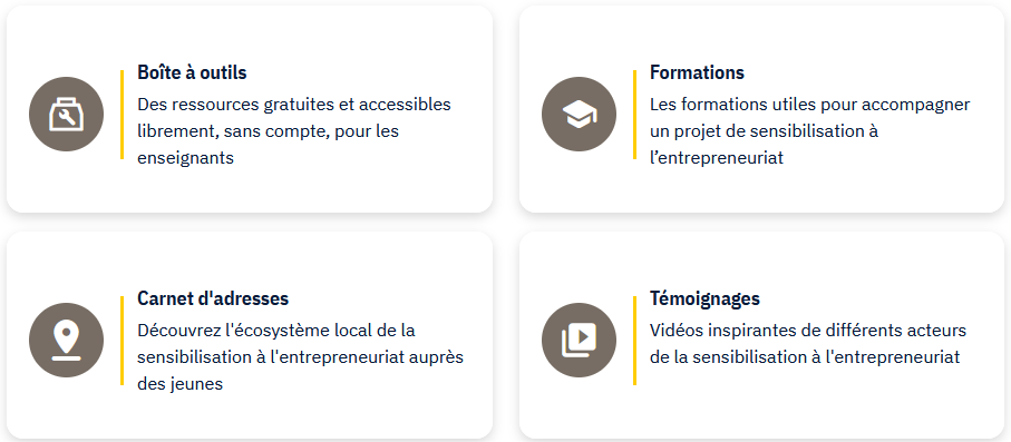 Cet espace, construit avec les réseaux nationaux qui œuvrent au développement de l’esprit d’entreprendre des jeunes, a vocation à rassembler au même endroit leur offre de services. Il permet aux enseignants d’identifier les acteurs qui peuvent intervenir auprès des jeunes à leurs côtés, les ressources et outils pour construire et animer des modules de sensibilisation, formation et accompagnement, et des formations pour monter en compétence sur ces sujets.