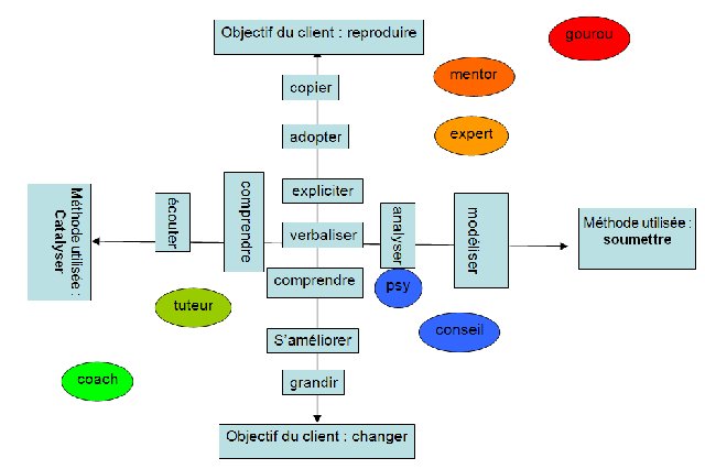 Pour illustrer ces différentes postures une carte perceptuelle croisant l’axe de l’objectif du client (entre changement et reproduction) et celui de la méthode utilisée a été réalisée par l’auteur pour l’obtention de son DU « coaching » de l’Université de Paris 2.(entre soumission et catalyse). On peut donc voir que la figure la plus proche du coaching serait celle du tuteur et qu’on retrouve des modes d’intervention (comme le conseil ou la thérapie) qui peuvent laisser penser que l’on répond à la même demande du client, la méthode et les outils utilisés seront par contre complètement différents. Enfin, dans le quadrant opposé, on retrouve les figures de l’expert et du mentor, qui prennent le contre-pied de celle du coaching et bien entendu la figure extrême du gourou.