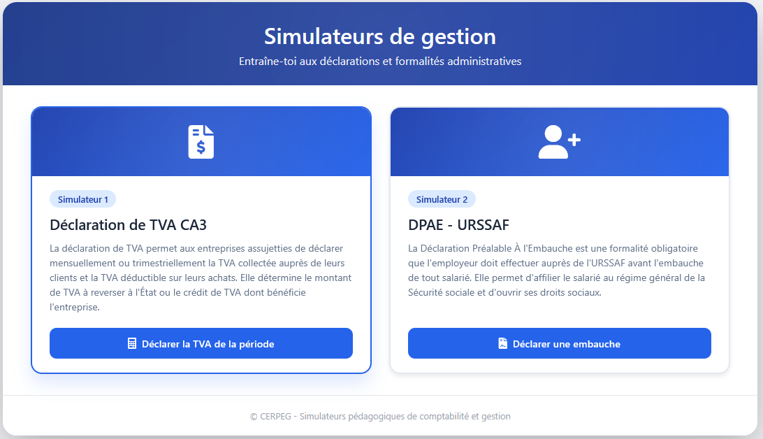 Le site du CERPEG propose deux nouveaux simulateurs pédagogiques consacrés à des démarches administratives essentielles en gestion : la Déclaration Préalable à l’Embauche (DPAE) et la déclaration de TVA.