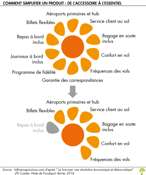 Le client raisonne donc en « value for money », en acceptant de « perdre » une partie du confort ou de l’accessoire de l’ancien produit ou de la prestation… mais avec une baisse des prix plus importante. Le low cost pourrait donc se résumer par cette « formule » :