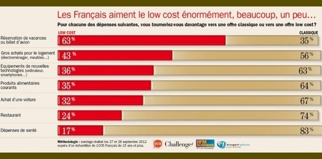 Le consommateur serait disposé à obtenir « moins qu’avant mais pour beaucoup moins cher ». C’est sur ce principe que ce sont développées les enseignes alimentaires de « hard discount » dans les années 80, en France. Le consommateur dispose d’une offre assez importante d’enseignes qui ne pratiquent pas le même type de low cost, en partant d’une analyse des besoins du consommateur.