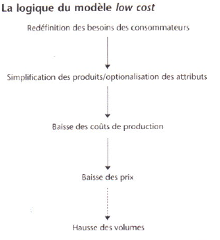 Ces quatre exemples montrent bien les contours du modèle. Il s’agit de partir de la demande finale, c’est-à-dire des besoins des consommateurs, pour les redéfinir dans le sens d’une simplification. Tout va être analysé pour éviter toute fonction annexe et ne retenir que le cœur du produit ou du service (« dormir » en hôtellerie low cost, « se nourrir » en hard-discount alimentaire, « aller d’un point A à un point B » en low cost aérien). Le modèle propose donc une offre de base, avec optionalisation de tous les attributs supplémentaires (restauration à bord des avions). La logique du low cost peut donc se résumer à travers un schéma permettant de la considérer comme un véritable modèle économique :