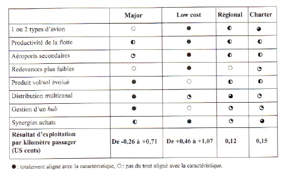 Lecocq distingue ainsi quatre modèles génériques dans le transport aérien et met en avant la logique du modèle low cost :