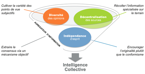 Selon Emile Servan-Schreiber (Chercheur en sciences cognitives aux USA), il faut quatre "ingrédients" pour produire de l’intelligence collective : diversité des opinions, décentralisation des sources, indépendance d’esprit et, enfin, un mécanisme objectif pour extraire le consensus en toute transparence. On peut le voir sur ce schéma :