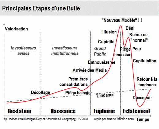 Le marché de l’immobilier français n’est pas un ensemble homogène. Il paraît évident de dissocier l’immobilier des grandes agglomérations de celui des régions rurales, l’immobilier de luxe de celui plus ordinaire. Malgré les disparités en termes d’attractivité du territoire et de spécificités intrinsèques du bien, des tendances générales apparaissent et un certain nombre d’analystes anticipent une chute importante des prix en raison de l’éclatement de la bulle spéculative qui nourrit le marché de l’immobilier français depuis une dizaine d’années. Cependant, l’immobilier occupe une place privilégiée dans le placement de l’épargne des Français qui perçoivent les actifs immobiliers comme une valeur refuge face aux variations incontrôlées et parfois absurdes de la valeur des actions et des obligations sur les marchés financiers. Il semble, cependant, illusoire de penser que les actifs immobiliers français ne sont pas soumis à la spéculation des investisseurs compte tenu de la hausse importante des prix de l’immobilier et de sa déconnexion par rapport aux facteurs dits « fondamentaux ». En effet, une bulle spéculative (schéma 1) représente une situation où le prix d’un actif financier augmente indépendamment des facteurs dits « fondamentaux » qui déterminent sa valeur « naturelle ». KINDLEBERGER (1994) [1] explique que précédant une bulle spéculative, l’optimisme s’installe dans un climat de confiance et de prospérité durable. La hausse des prix est en cours et s’alimente d’elle-même jusqu’à tourner à l’euphorie spéculative. La dynamique d’une bulle spéculative repose sur une perte de rationalité et un excès de confiance et d’euphorie. Pour ALBOUY (2005), « l’important à ce stade n’est plus de savoir si l’action est à son juste prix – sa valeur fondamentale – mais d’anticiper ce que les autres vont faire. La hausse entretient alors la hausse et le marché se déconnecte de la réalité économique ». Par conséquent, la rationalité individuelle de l’investisseur n’est pas déconnectée de l’irrationalité collective du marché (O. BLANCHARD, 1979). KEYNES a montré qu’il existe une rationalité à anticiper ce que les autres intervenants anticipent puisque celle-ci est auto-validante. La hausse du cours s’explique par les anticipations des investisseurs et le comportement mimétique qui en découle. Si le prix intrinsèquement justifié d’un bien n’est pas corrélé à son rendement, sa fixation demeure incertaine. Tant que les facteurs fondamentaux justifient une hausse des prix et qu’un nombre suffisant d’acteurs se montrent confiants, on ne peut guère évoquer une bulle immobilière [2].