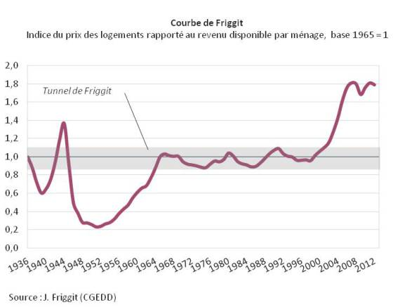 Un des premiers facteurs fondamentaux est le revenu annuel moyen d’un ménage français. Jacques FRIGGIT (voir schéma 2) relève que, de 1965 à 2000, l’indice du prix des logements en France a augmenté approximativement au même rythme que le revenu par ménage (« tunnel de Friggit » ou « courbe de Friggit »), mais a ensuite crû beaucoup plus rapidement, atteignant en 2007 puis en 2010 un niveau supérieur de 70 % à cette tendance longue. Ainsi, le prix des logements est passé de deux fois et demie à plus de quatre fois le revenu annuel moyen par ménage. Jacques FRIGGIT argue que le prix des logements rejoindra à terme cette tendance longue, l’incertitude portant sur le rythme auquel ce retour s’effectuera : un scénario rapide correspondrait à une diminution cumulée du prix des logements de 35 % en cinq à huit ans ; un scénario lent correspondrait à un prix des logements restant constant pendant quinze à vingt ans, le « tunnel » n’étant rejoint que sous le lent effet de la croissance du revenu par ménage. Au vu des évolutions passées, un scénario rapide serait plus probable qu’un scénario lent, mais ce dernier ne peut être exclu.