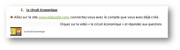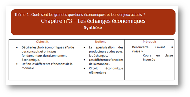 « Travaillant avec l’équipe de première en économie-droit, nous avons mutualisé nos approches afin de proposer une classe inversée concernant le chapitre 3 Les échanges économiques du thème 1. J’ai préparé un document de découverte des notions intitulé "Avant la classe". Il est composé de documents notionnels (texte / vidéo / schéma) ainsi que d’exercices d’application. Ce document a été remis et présenté aux élèves, 2 semaines avant son utilisation en classe. Au bout d’une semaine, j’ai transmis la correction des exercices aux élèves. »