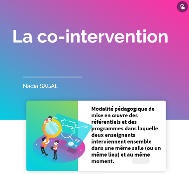 La co-intervention permet de rompre l’isolement, d’ouvrir un espace de co-formation pour faire évoluer les pratiques grâce à des dispositifs d’observation mutuelle entre enseignants et/ou de co-élaboration des situations d’apprentissage. (2)(5)