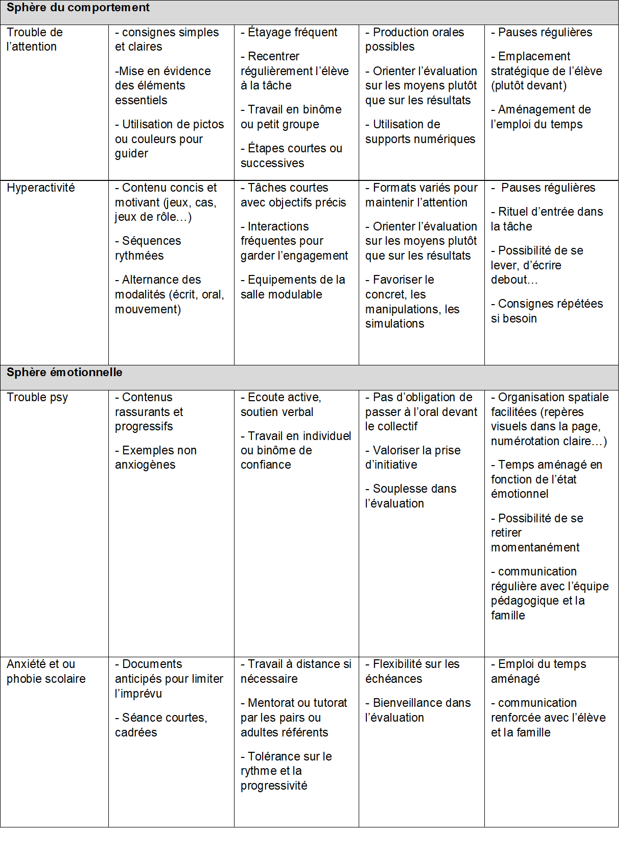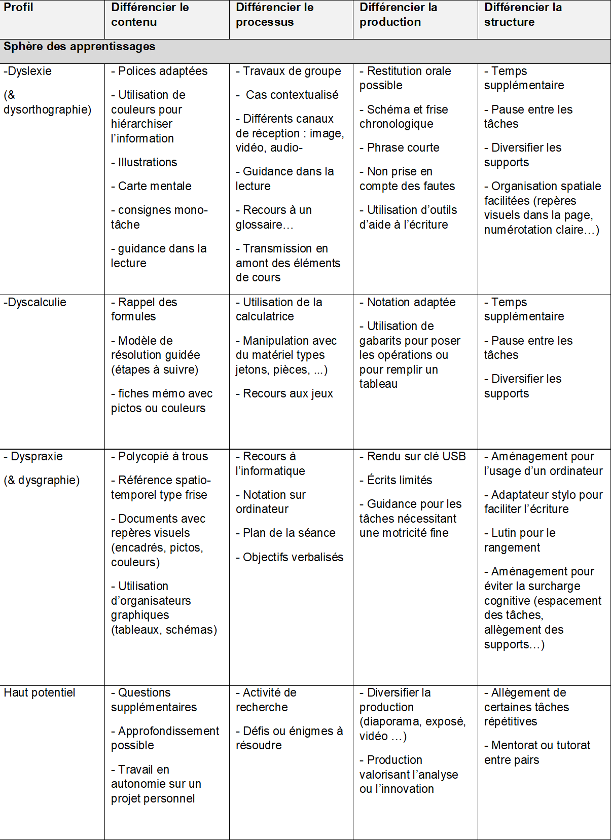 Il est impossible dans une brève chronique d’énumérer tous les profils d’élèves tant ils sont variés. Néanmoins, nous présentons dans ce tableau les profils les plus remarqués et proposons quelques outils d’adaptation en suivant les axes énumérés précédemment :