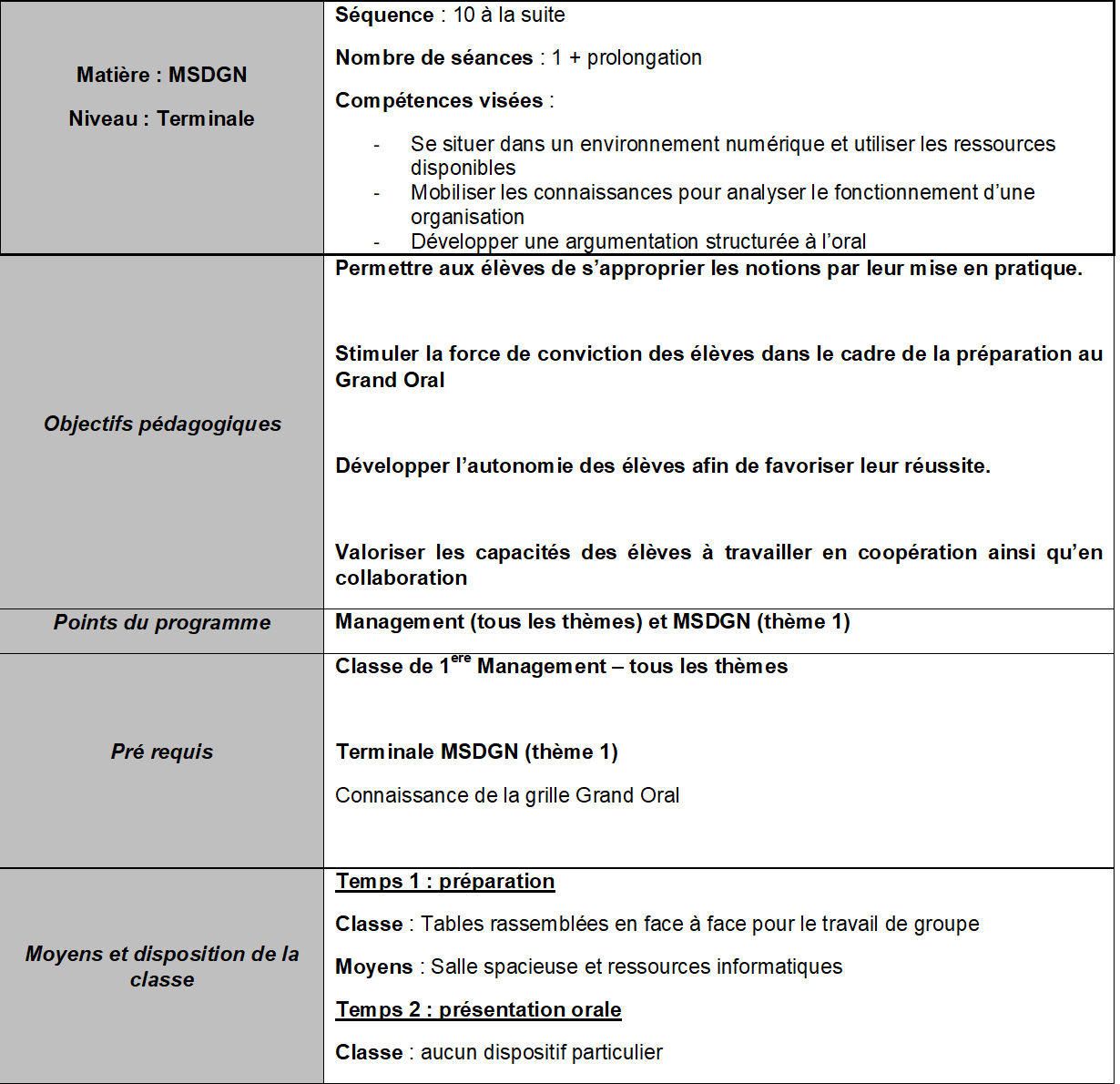 Voici l’exemple d’une séquence nommée « 10 à la suite ». Elle est composée de 5 séances, la séance 4 étant la principale. Durant celle-ci, et après avoir participé à la construction d’une fiche d’aide dans les séances précédentes, chaque élève va présenter une notion du programme MSDGN/Management devant la classe dans un premier temps puis démontrer une capacité à formuler des réponses à des questions posées à la volée par les autres élèves dans un deuxième temps.