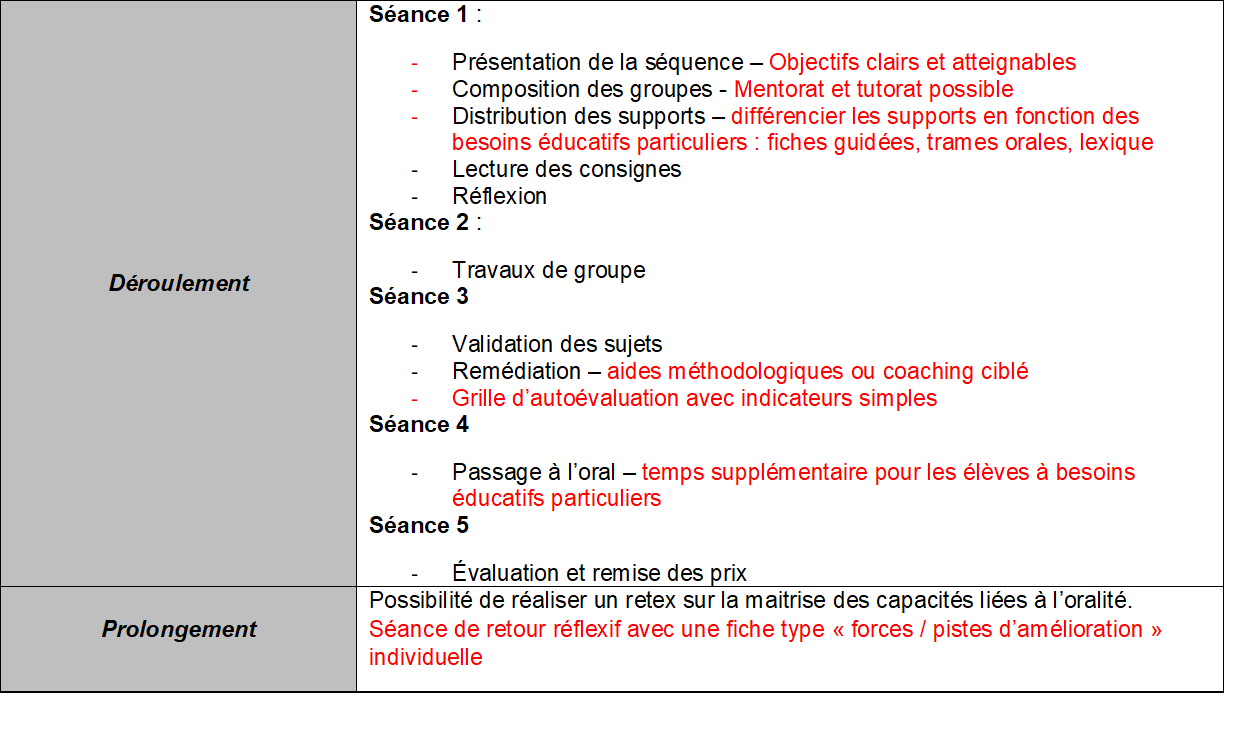 - Séance 1 : explication du travail à faire, constitution de quatre groupes (un pour réaliser une charte de conduite durant l’oral, un pour réaliser une fiche méthode sur la force de conviction, un pour réaliser une fiche d’aide au rôle d’interrogateur et enfin un pour réaliser une fiche sur le rôle du présentateur)