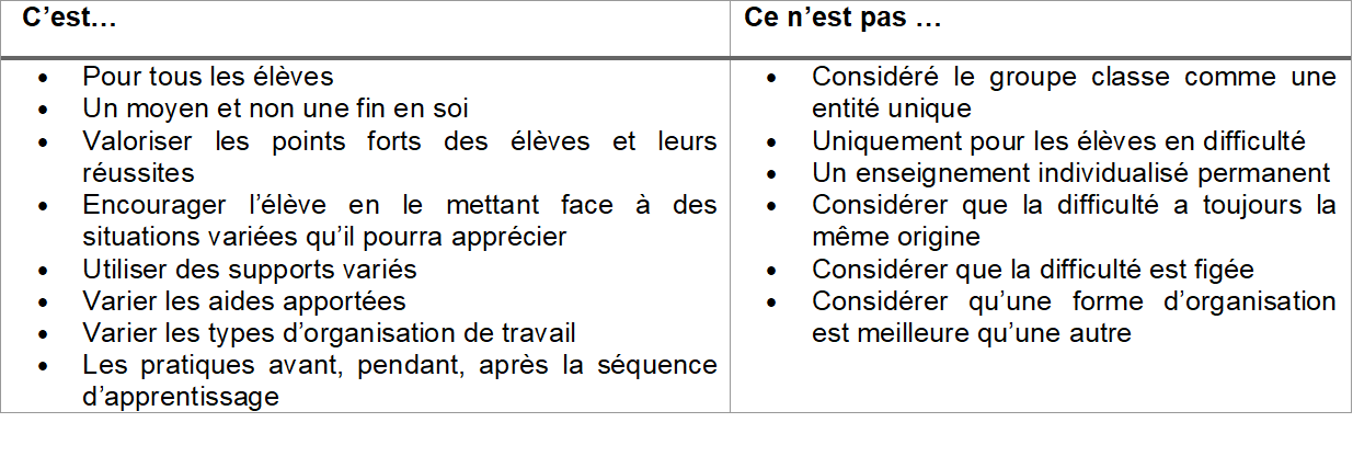 La différenciation pédagogique consiste à mettre en œuvre un ensemble diversifié de moyens pédagogiques et didactiques pour permettre à des élèves d’aptitudes et de besoins différents d’atteindre par des voies différentes des objectifs communs.