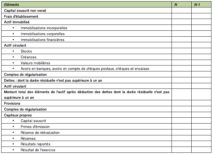 Les mêmes rubriques du bilan consolidé sont maintenues à savoir : l’actif immobilisé (immobilisations incorporelles, immobilisations corporelles et immobilisations financières), l’actif circulant (les stocks, les créances, les valeurs mobilières de placement, les disponibilités, les capitaux propres, les provisions, les dettes, la part des actionnaires ou associés minoritaires. L’article précise que le bilan consolidé est à établir selon un modèle fixé par un règlement de l’ANC.