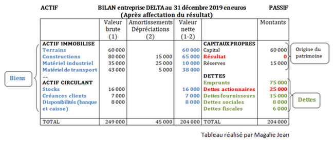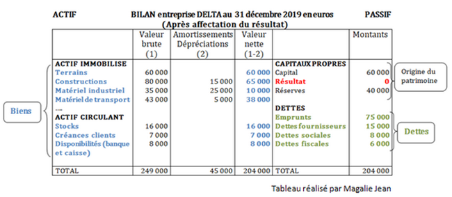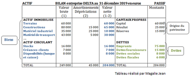 Dans le cas présent, depuis sa création, l’entreprise Delta s’est constitué un patrimoine composé de [**biens*] pour un total de [**204 000 €*] et de [*dettes*] pour un total de (75 000 + 15 000 + 8 000 + 6 000) [*104 000 €*]. La valeur de son patrimoine au 31 décembre 2019 s’élève à 204 000 – 104 000 = 100 000 €. Cette valeur correspond à sa valeur financière au 31 décembre 2019. En plus de la composition du patrimoine, le bilan fournit une seconde information au niveau des capitaux propres qui expliquent l’origine de ce patrimoine. Dans le cas présent, l’entreprise a réussi, depuis sa création, à se constituer ce patrimoine grâce à ses propriétaires qui ont apporté 60 000 €, à son activité de l’année pour 25 000 € et celle des années précédentes pour 15 000 €. On retrouve bien la valeur de 100 000 €.