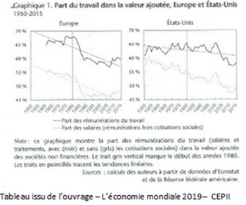 Sur cette thématique du partage de la valeur ajoutée, l’article écrit par Sophie Piton et Antoine Vatan publié dans l’ouvrage – L’économie mondiale 2019 – proposé par le CEPII – Centre d’Études Prospectives et d’Informations Internationales, fait le constat de la baisse de la part de la valeur ajoutée attribuée au travail depuis le début des années 1980 et propose d’en expliquer les causes.