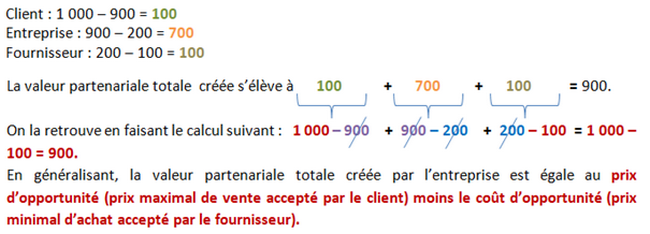 - Soit un client prêt à acheter le produit à 1 000 et qui obtient finalement un prix de 900. Il y gagne pour 1 000 – 900 = 100. 100 est la valeur créée par l’entreprise au profit du client.