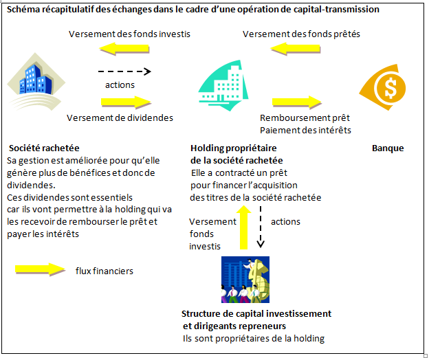 Il implique le montage suivant : les titres de la société rachetée le sont par une holding (il s’agit d’une société qui n’a pas d’activité industrielle et qui détient uniquement des droits de propriété sur d’autres sociétés). Cette holding est elle-même possédée par les dirigeants repreneurs et la structure de capital investissement qui participe à l’opération. Le financement de l’acquisition des titres de la société rachetée par la holding est réalisé au moyen d’un prêt bancaire contracté par cette dernière. Le remboursement de ce prêt et le paiement des intérêts seront réalisés grâce aux dividendes reçus de la société rachetée. Il faut donc que la société rachetée verse suffisamment de dividendes pour permettre ce remboursement. L’objectif est ainsi d’augmenter la rentabilité de la société rachetée. Par la même occasion, cela permettra d’augmenter la valeur de la société rachetée et donc celle de ses droits de propriété et par la suite de vendre ces derniers en réalisant une plus-value à moyen terme.