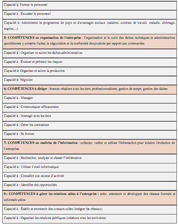 Il faut également présenter les travaux très poussés de Boughattas et Bayad au CEREFIGE de l’université de Nancy. En s’intéressant aux cas des très petites entreprises, ils ont mené plusieurs recherches qualitatives pour affiner un référentiel mixant compétences, capacités et aptitudes. Leur démarche a permis d’identifier et de mettre sur pied un référentiel permettant l’autoévaluation des entrepreneurs. Pour cela, ils ont confronté le référentiel conçu par des experts à des entrepreneurs de TPE. Il en ressort un document très complet avec 7 compétences génériques, 25 capacités et 88 aptitudes. Dans une autre étude, avec Christophe Schmitt, ils vont pointer une nouvelle compétence générique (la maîtrise de l’information) et développer 39 capacités.