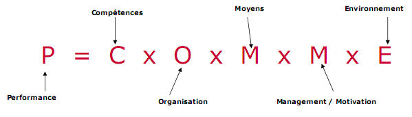 Lorsqu’on s’intéresse à la dynamique de la performance et à ses liens avec les compétences, on se doit de considérer la performance comme un produit complexe composé de différents éléments combinés : les compétences, l’organisation, les moyens, le management et la motivation ainsi que l’environnement. On peut la schématiser :
