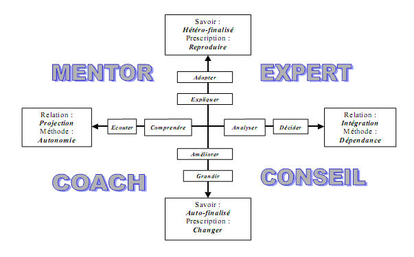 L’accompagnateur va agir en facilitant l’adaptation par un processus de « décadrage » et « recadrage » de la situation nouvelle (Bateson, 1972). La question de la relation dans l’accompagnement sera alors centrale. Quelle posture adopter pour accompagner ? Les contours du positionnement des figures de l’accompagnement ont été mises en avant dans le mémoire pour le D.U. de coaching de l’université de Paris 2 (Jacquet, 2005, cité par le CEREFIGE, 2010) :