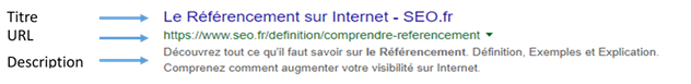 Lors d’une recherche, les résultats proposés (SERP ou Search Engine Result Page) font apparaitre l’URL mais également le titre et la description correspondant respectivement au texte saisi pour la balise titre et la balise méta description (codage HTML). Ces contenus doivent donc donner envie à l’internaute d’accéder au site sans pour autant le décevoir.
