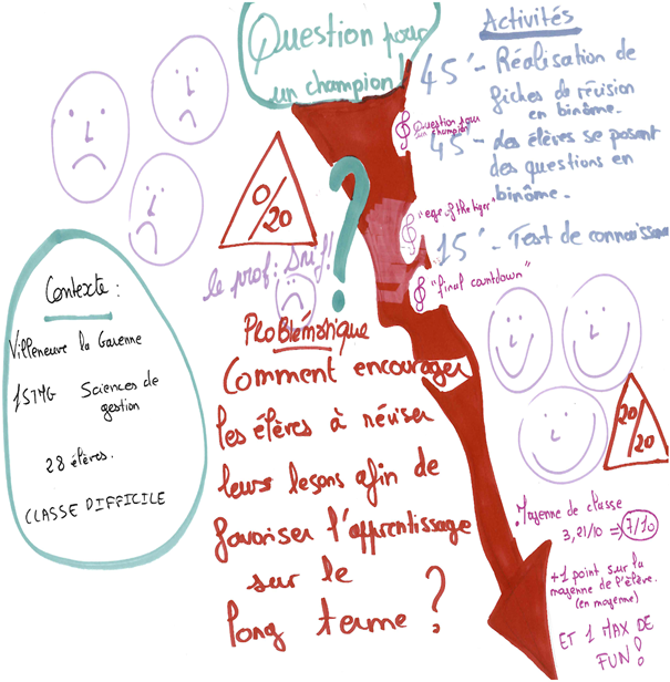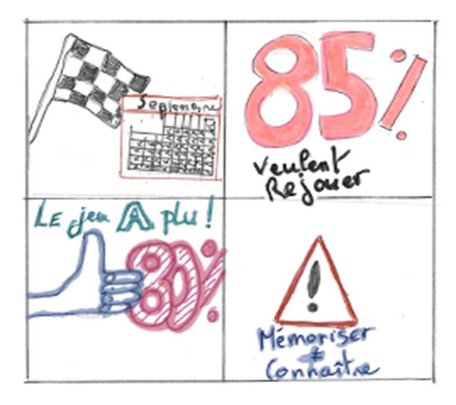 | L’expérimentation que j’ai choisi de mener a pour objectif de créer et d’utiliser un support ludique facilitant la mémorisation des élèves. Étape 1 : Création du jeu de cartes pédagogique (Séance d’une heure) Les élèves s’installent, par îlots, dans la salle de classe. Les groupes auront été constitués au préalable en veillant à recréer des groupes hétérogènes en termes de niveau afin qu’une entraide efficace puisse s’installer entre les élèves. Seront distribués : une liste de mots + des cartes vierges + des images à découper et à coller. Les élèves auront par ailleurs librement accès à leurs cours. L’objectif de la séance sera de retrouver dans leurs cours, la notion associée à chacune des images. Chaque élève disposera en fin de séance de son propre support (jeu de cartes). Étape 2 : Poursuite du jeu de cartes par les élèves. En fin de séance, des images supplémentaires seront distribuées aux élèves pour poursuivre la construction du jeu (au fur et à mesure de l’avancée du programme). Les élèves devront alors associer les notions abordées par la suite aux images restantes. Étape 3 : Utilisation du jeu de cartes en classe (rituel à mettre en place tous les vendredis) La classe de TSTMG1 a cours de mercatique le vendredi après-midi en dernière heure. Lors de ces séances, le groupe rencontre davantage de difficultés à se concentrer. Afin d’impliquer les élèves et de les remobiliser sur cet horaire, il pourrait être possible de réinvestir ce jeu de cartes au format ludique sur une durée courte (15 minutes en début de séance par exemple) pour travailler sur la répétition des notions et / ou faire le point sur les nouvelles notions identifiées par les élèves au cours de la semaine. → Ce jeu de cartes facilitera particulièrement l’accès à certaines notions pour les élèves les plus en difficulté, sans pour autant exclure les élèves les plus à l’aise qui pourront également en faire un support de révision utile. Lorsqu’il sera mobilisé en classe, ce jeu sera aussi l’opportunité pour les élèves d’échanger ce qu’ils ont compris des notions avec leurs propres mots, facilitant ainsi l’entraide et la coopération au sein du groupe |