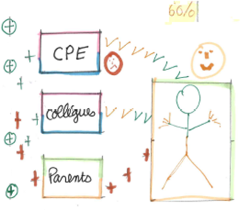 | Comment transformer un élève perturbateur en un élément moteur pour la classe ? Un accompagnement global et positif est mis en œuvre : Mobilisation de l’équipe pédagogique : Enseignants, CPE, famille autour de Joris dans un esprit bienveillant. Il est décidé de mobiliser Joris (en le faisant aller souvent au tableau, distribuer des copies, solliciter sa prise de parole), de le valoriser en le remerciant, et en lui notifiant des signes positifs à chaque fois que possible. Cet accompagnement s’inscrit dans une reprise en main de la classe par toute l’équipe pédagogique : discours d’unité et rituels d’entrée en classe (calme, deux par deux, sans casquette). Les résultats sont spectaculaires sur Joris et sur l’ambiance de classe. |